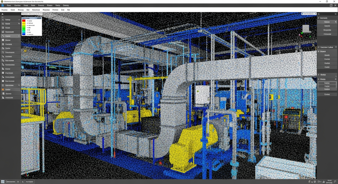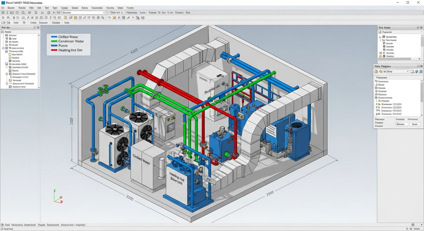 We deployed multiple terrestrial LiDAR scanners across 48 scan positions to capture the entire mechanical plant at millimeter-level accuracy. The resulting point cloud was registered and processed into a fully coordinated Revit model showing all piping runs, duct routing, conduit paths, and equipment footprints with their exact positions. The model included clearance annotations and connection point details needed for the engineering team to design the chiller replacement without field conflicts.